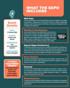 The 19th Supply Chain & Logistics Expo is the leading annual gathering for Cyprus’ logistics and supply chain professionals. The event brings together key industry players to analyze, evaluate, and discuss the latest developments, emerging trends, and pressing challenges shaping the future of the sector. It serves as a platform for knowledge exchange, networking, and innovation, driving progress and competitiveness in the logistics landscape.